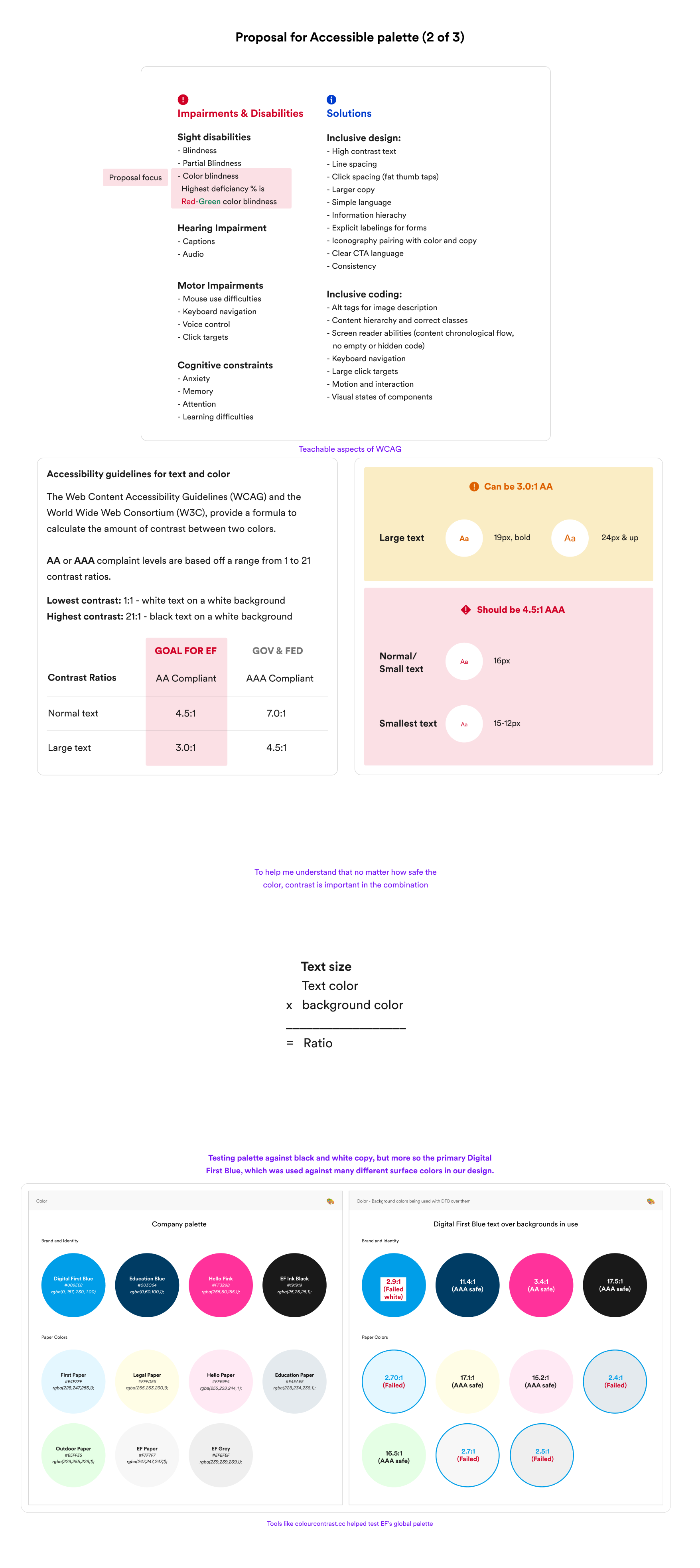 Accessibility in our color palette: I advocated to improve the palette to cater to accessibility to ensure our participation in inclusive design. After discovery work and research, I created a new palette and shared the importance of making changes with the global creative team who own the company wide style guide. The palette effort and many accessible feature changes reached other company product sectors, by mentorship and/or collaboration with designers in our company.